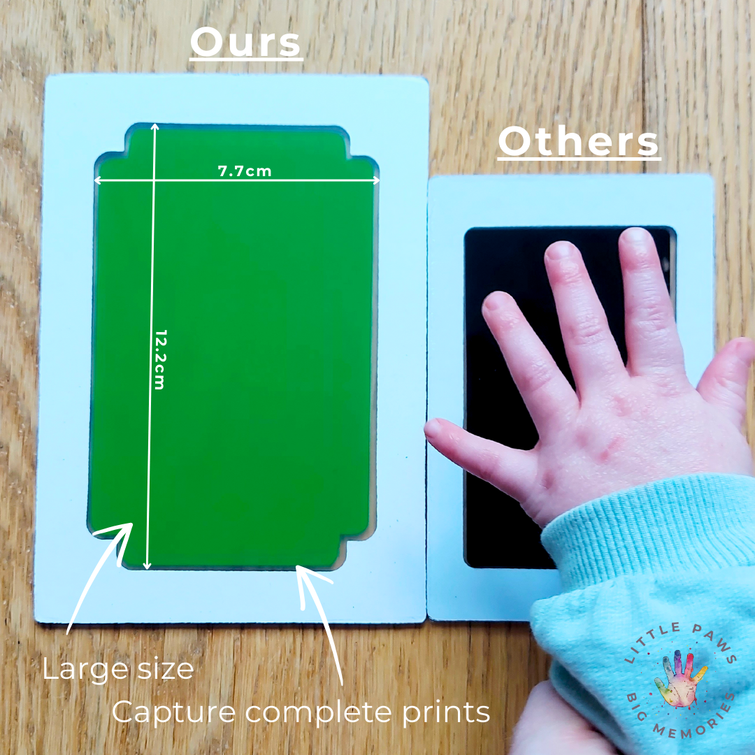 Extra Large Size – the ink window itself measures 12cm x 7.5cm (not including the frame), much larger than others on the market. This ensures you capture every precious detail. The ink pads will get you approximately 2-4 prints (depending on size of baby/type of print etc), and they come in a plastic case to prevent drying out.